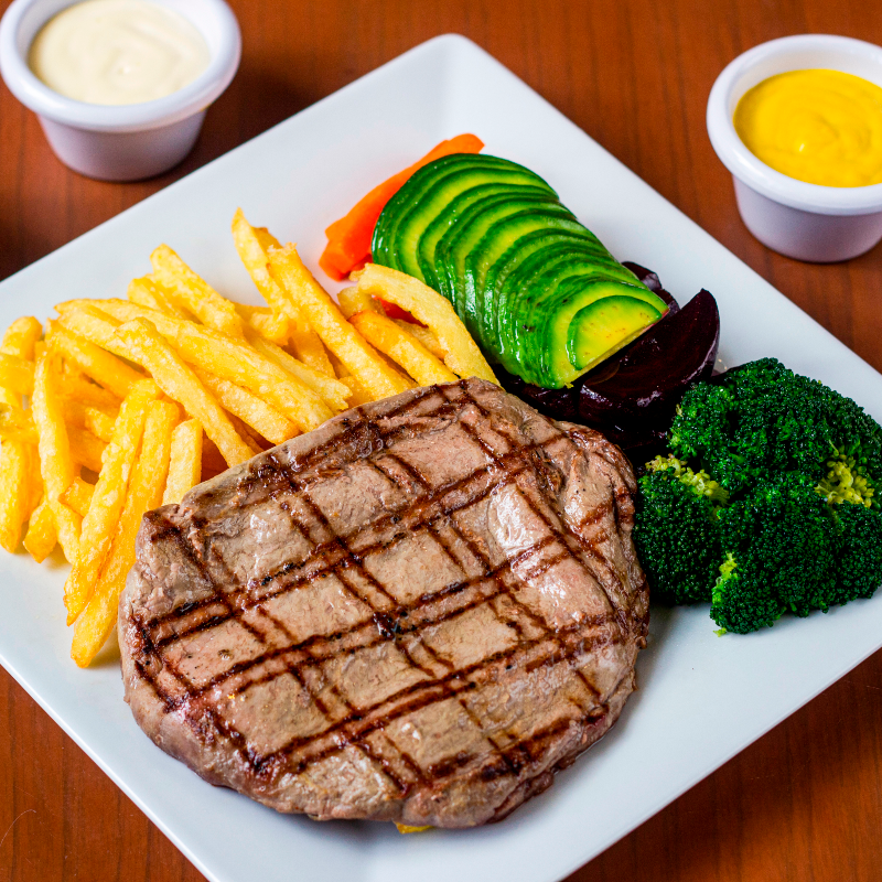 Descubre la perfección en cada bocado con nuestro jugoso lomo fino a la parrilla, sazonado con un toque especial de la casa y cocido al punto exacto para resaltar su sabor natural. Acompañado de papas fritas doradas y crujientes, y una selección de ensaladas frescas de la huerta que equilibran el plato con un toque ligero y refrescante. Una combinación clásica y deliciosa que deleitará tu paladar desde el primer momento.